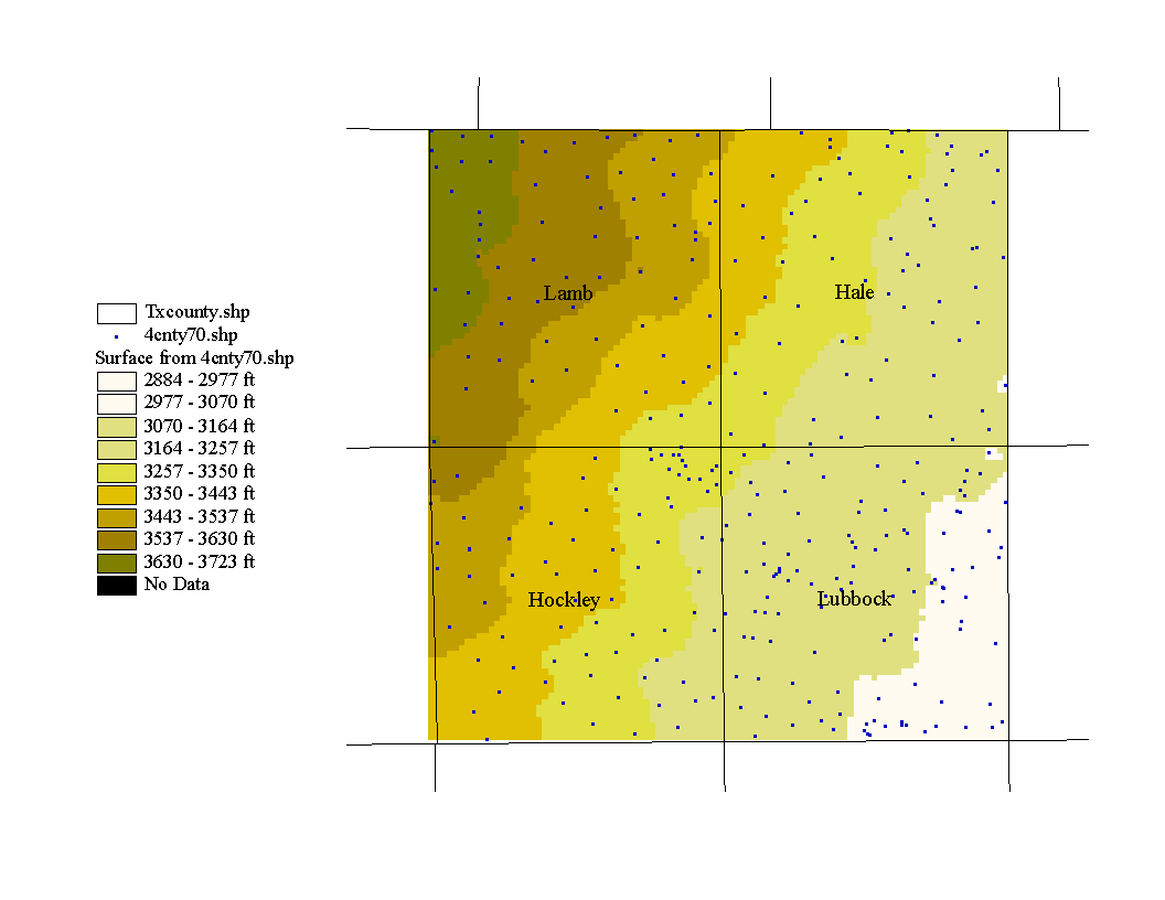 The following is a potentiometric surface generated from data from Lubbock, Lamb, Hale, and Hockley counties during January 1970. The county outlines overlaid on the map were obtained from the Texas Natural Resources Information Service web site.