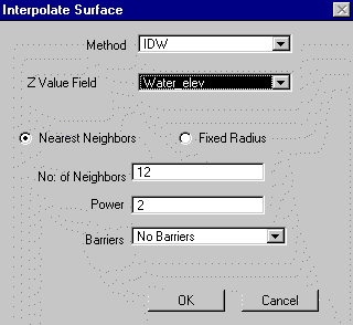 Now, the data can be used to create a potentiometric map. First, make sure that the extension Spatial Analyst is active. If not, make the project window active and go to File/Extensions. Then, with the view active, select: Surface/Interpolate Grid. The following box should appear: