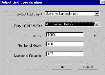 The Output Grid Extent should be the same as your data file. The cell size and number of rows and columns are automated, although you can change these values. I have chosen to use a cell size of 1000m here.