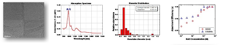 The purpose of this proposal is to fundamentally understand the effect of structural properties of SWNTs on their fate and biological behavior in the natural aquatic environment. The study design involves systematic evaluation of aggregation, deposition, organic compound sorption, and uptake/toxicity in fish (Japanese medaka) for semiconductive SWNTs for a range of electronic structures (with consequent variation in diameter and chirality). These studies will be fully novel, as there are no fundamental studies reported in the literature examining the effect of basic structural properties on environmental fate and implications of SWNTs. The research proposed will address the following aims. (1) Fractionation of semiconductive SWNTs by diameter/chirality using density gradient ultracentrifugation; (2) examination of aggregation and deposition kinetics of diameter/chirality-sorted SWNT fractions as a function of organic matter concentration and ionic strength using state-of-the-art dynamic light scattering, quartz crystal microbalance, and conventional column-flow transport experiments; (3) determination of the effect of SWNT diameter/chirality on organic contaminant adsorption using common headspace-partitioning methods; and (4) assessment of the uptake, biodistribution, and toxic effects of diameter/chirality-sorted SWNTs in Japanese medaka fish after waterborne- or dietary exposure using near-IR fluorescence spectroscopy and microscopy.