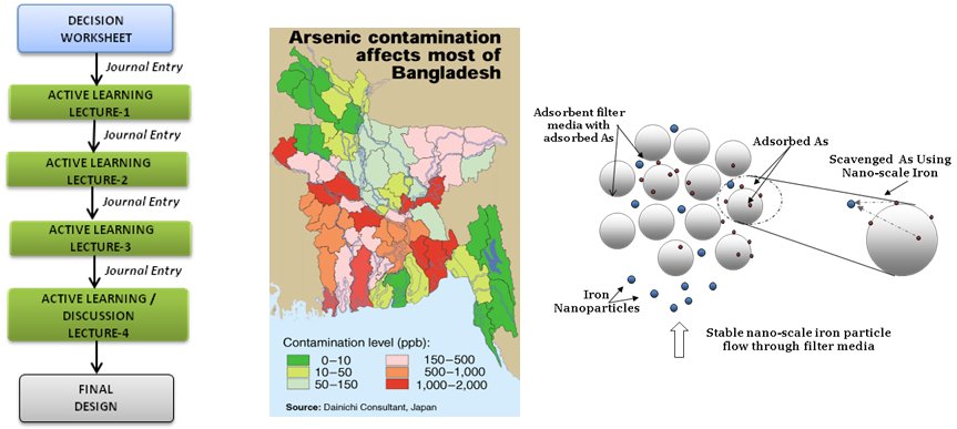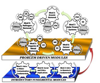 The new Introduction to Nanotechnology course will be inquiry- based, that is, taught through addressing a 'driving question' on the common water decontamination theme. The teaching methods will include, but are not limited to, the use of scientific literature to choose the driving question for each focus area. There will be eight modules that will be developed for the class. The modules are: (i) General physics, chemistry, and biology at the nano-scale, (ii) i Introduction to global water contamination issues, (iii) Arsenic contamination and remediation, (iv) Pathogen (bacteria and virus) contamination and remediation, (v) Organics/metal contamination and remediation, (vi) Chemical sensor technology, (vii) Alternative power supply (solar) for water treatment, and (viii) Social and ethical implications of nanotechnology. Modules 1-7 will occupy 2 weeks each in a semester (14 weeks total), taught 3 hours per week. Module 8 (societal) will meet each week for an hour and discuss practical ethical issues that may arise from implementation of technical aspects under examination that week.